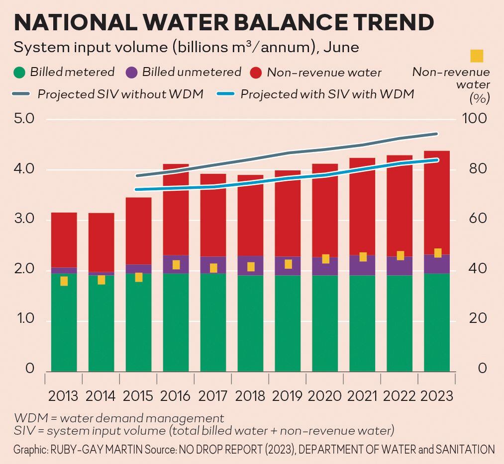 This systemic failure has created a financial doom loop. Operational decay — driven by a lack of investment, maintenance and skills — leads to staggering physical losses. SA’s nonrevenue water (water produced at cost but lost before reaching customers, mainly due to leaks) has climbed steadily over the past 10 years from 36.5% of total available potable water in June 2013 to 47.4% in June 2023. This translates directly into financial losses.